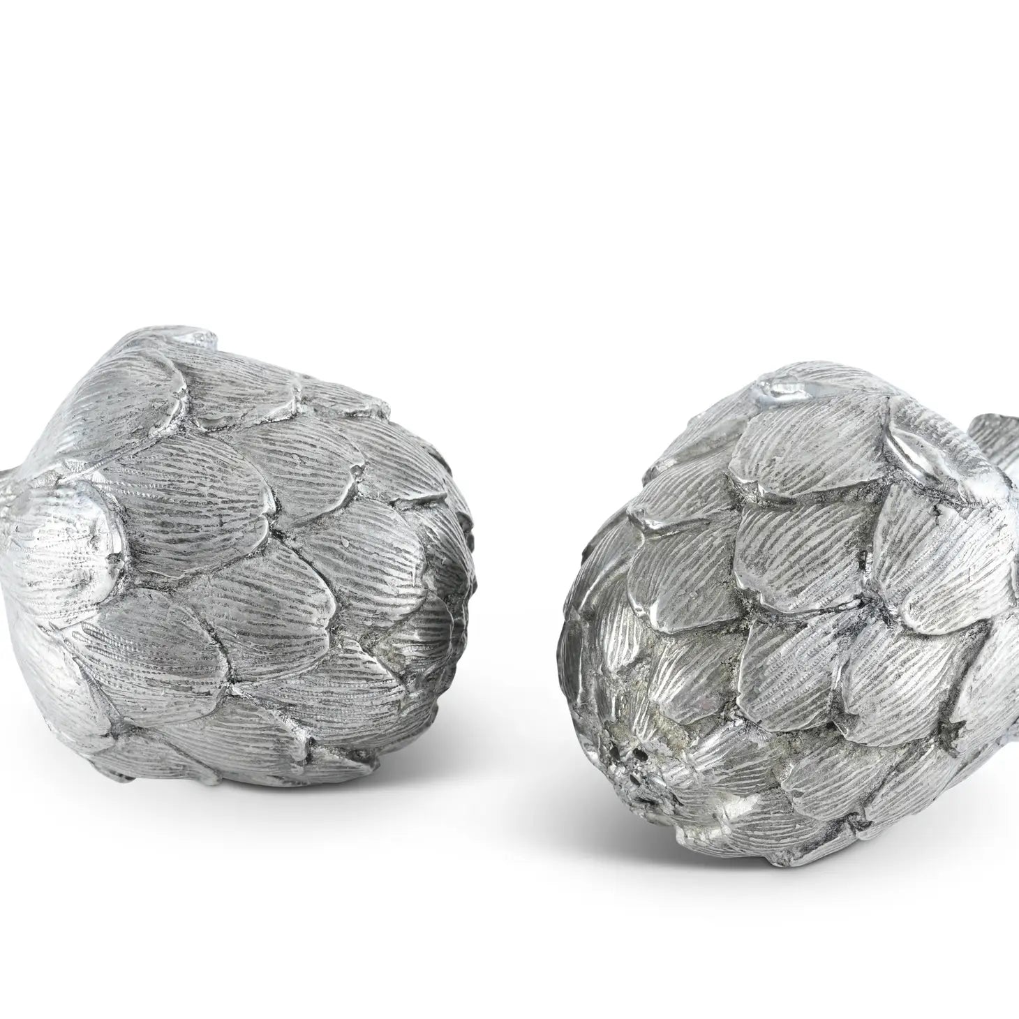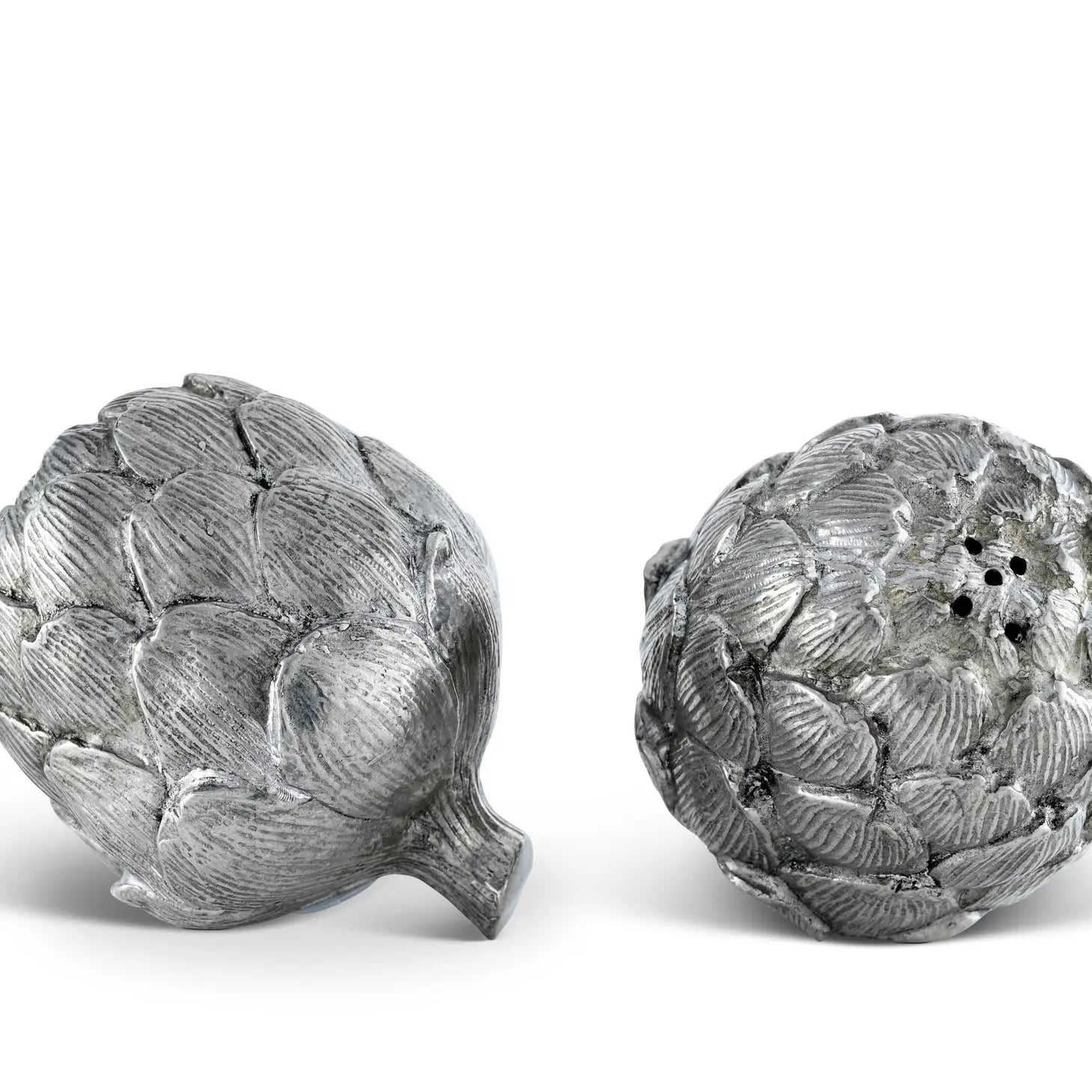Expert craftsmanship characterizes the design of Vagabond House's Artichoke Salt and Pepper Set. Realistically textured leaves cover the surface of these pieces, which are crafted in luxury-grade pewter. The shaker holes hide within the intricate top of each vegetable, while a stem emerges from the opposite end as an added accent.